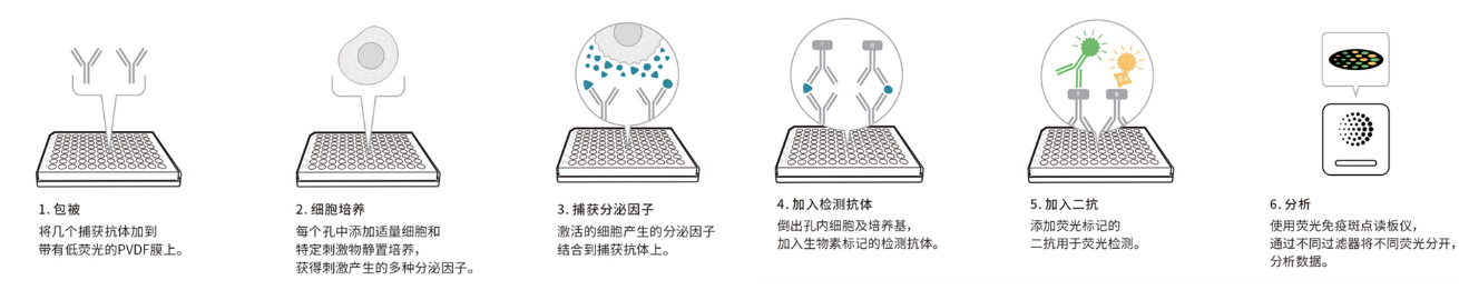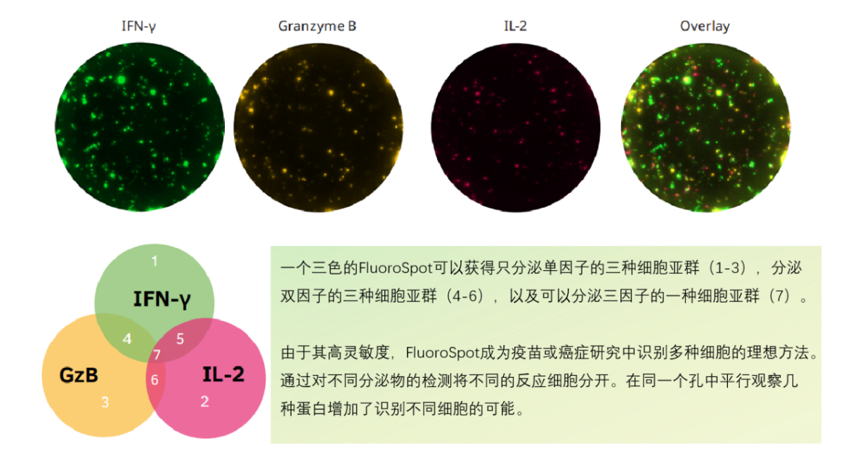 相比于ELISpot,F(xiàn)luoroSpot依舊維持了ELISpot的高靈敏度,還能對(duì)單細(xì)胞分泌的多種細(xì)胞因子同時(shí)進(jìn)行檢測(cè),從而實(shí)現(xiàn)細(xì)胞亞群的鑒定和細(xì)胞多功能性分析。