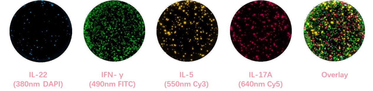 該圖為Mabtech FluoroSpot Plus: Human IL-22/IFN-γ/IL-5/IL-17A(Cat#FSP-18010803-2)的實(shí)驗(yàn)結(jié)果,四個(gè)檢測(cè)通道對(duì)應(yīng)的DAPI,F(xiàn)ITC,Cy3,Cy5。