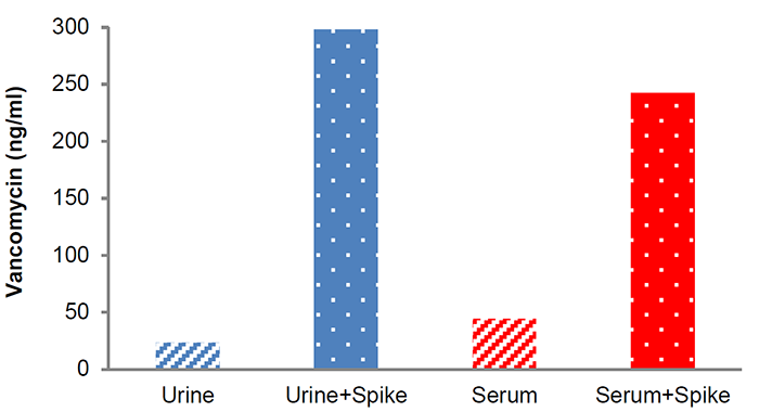 加標(biāo)回收實驗: 人血清和尿液樣本加300ng/ml的萬古霉素,回收率為80-100%。