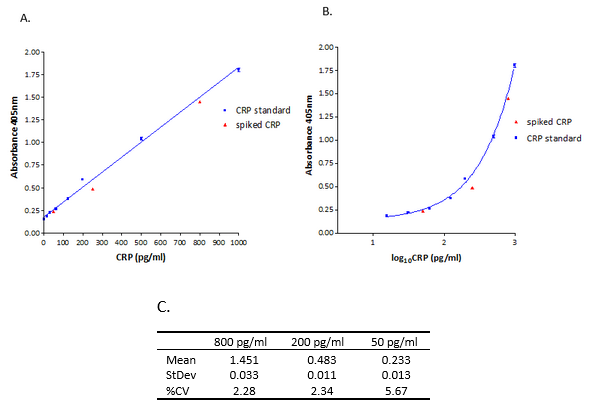 1. 使用LL-HRP標(biāo)記CRP檢測(cè)抗體并使用CRP標(biāo)準(zhǔn)品做校準(zhǔn)曲線的ELISA檢測(cè);