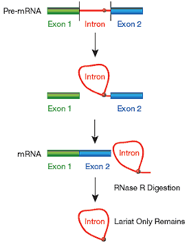 隨著環(huán)狀RNA的深入研究,環(huán)狀RNA制備問題就越來越備受關(guān)注。Lucigen提供大腸桿菌來源的RNase R,是一種Mg依賴性的3’ →5’核糖核酸外切酶,能消化基本上所有線性RNA,但不消化套索或環(huán)狀RNA的結(jié)構(gòu),或者3’突出短于7個核苷酸的雙鏈RNA。即是除了tRNA,5S RNA和內(nèi)含子套索結(jié)構(gòu)外,大多數(shù)細胞RNA都將被RNase R完全消化。如圖4,RNase R可從總RNA中分離出內(nèi)含子前體mRNA剪切產(chǎn)生的套索RNA。以這種方法獲得的RNA作為模板來生產(chǎn)標記的cDNA,可作為含有潛在的內(nèi)含子序列的微陣列的目標,或者用于包含完整的染色體或者基因組的重疊區(qū)域平鋪陣列。產(chǎn)生的cDNA不代表線性內(nèi)含子,但其含有的序列是來源于內(nèi)含子的。