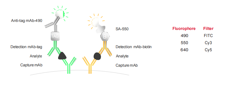 FluoroSpot能夠分析抗原特異性的多功能T細胞,例如,IFN-γ和IL-2的分析。三明治夾心結(jié)構(gòu)在熒光斑點中得以應(yīng)用,不同特異性的單克隆捕獲抗體混合物被包被于96孔板的PVDF膜上,生物素標記的檢測抗體識別一種分泌物,tag標記的檢測抗體識別其它的分泌物來實現(xiàn)雙色或三色細胞因子分泌細胞的檢測。檢測通過帶有特定熒光基團的共軛試劑放大信號斑點,可用自動讀板器進行分析。