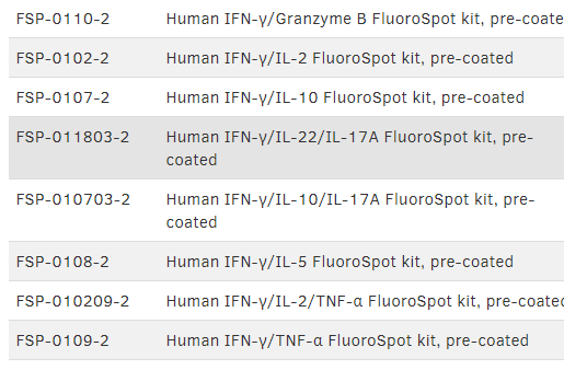 通過分泌單,雙和三色細胞因子分析劃分功能性T細胞亞群在許多不同的研究領(lǐng)域均引起極大的興趣。FluoroSpot可用于疫苗開發(fā),主要用于檢測和分析疫苗特異性免疫應(yīng)答。在癌癥研究中,F(xiàn)luoroSpot可用于,例如監(jiān)測腫瘤浸潤淋巴細胞或通過同時分析IFN-γ和顆粒酶B的分泌,以提供細胞毒性T細胞反應(yīng)更直接的評估。Mabtech公司提供了各種不同的熒光斑點試劑盒用于單,雙和三色分析物的T細胞的分析,其中IFN-γ可單獨分析或與幾個不同的分析物同時進行分析。
