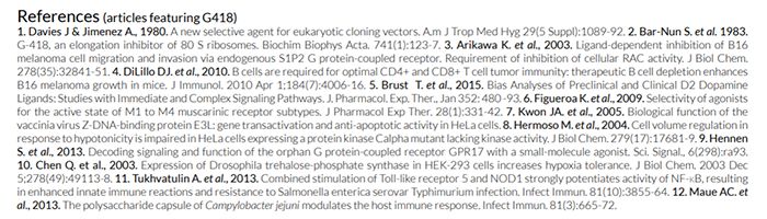 InvivoGen建議的工作濃度:G418通常以400 μg/ ml的濃度使用。當然仍需要為您的細胞確定最佳濃度。下面列出了常見哺乳動物細胞使用G418篩選的濃度(參見下表)。