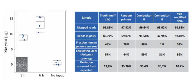 TruePrime?采用MDA技術,基于新型的TthPrimPol 引物酶和Phi29 DNA聚合酶,擴增過程無需添加隨機引物,減少了擴增偏倚,提高了擴增過程的覆蓋率和保真性,并且對于污染的外源DNA不敏感,可重復性好。TruePrime?可用于單個細胞或少量細胞的全基因組擴增,與常見的NGS平臺如Illumina和IonTorrent等兼容性良好。
