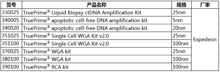 擴增能力強,無引物互作,無擴增偏倚,覆蓋率高,保真性好,重復性好,集諸多優(yōu)勢于一身的TruePrime?,還有什么理由不選擇呢?TruePrime?會為您的單細胞測序工作帶來極大的便利!除此之外,Expedeon還提供用于擴增cfDNA, circular DNA等多種類型DNA的試劑盒喲!