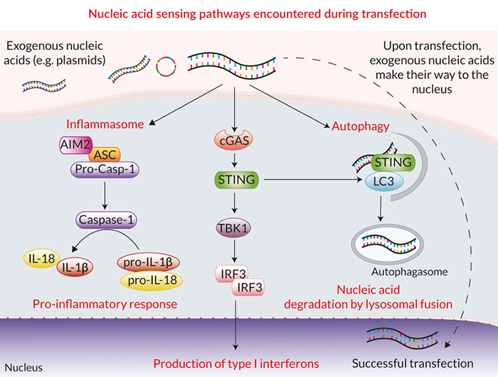 在真核細(xì)胞轉(zhuǎn)染期間,外源核酸(如質(zhì)粒DNA)的主要障礙是它們會(huì)被胞質(zhì)傳感器檢測(cè),如cGAS/STING,AIM2炎癥小體和LC3介導(dǎo)的自噬。這些防御性級(jí)聯(lián)信號(hào)的激活通常會(huì)導(dǎo)致低轉(zhuǎn)染效率、降低的細(xì)胞活力和不一致的結(jié)果,尤其是在難轉(zhuǎn)細(xì)胞(如免疫細(xì)胞)的轉(zhuǎn)染實(shí)驗(yàn)中。NATE?抑制許多核酸感應(yīng)途徑,從而保護(hù)外源DNA并促進(jìn)其表達(dá)。