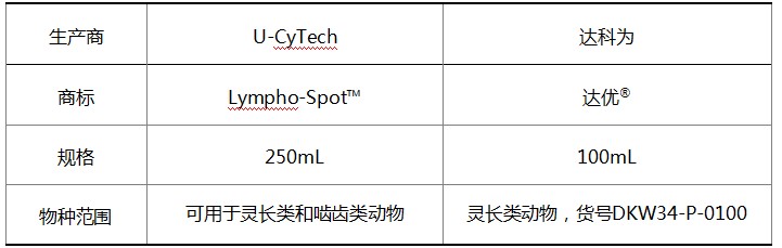 目前,我們同時(shí)提供U-CyTech原產(chǎn)的Lympho-Spot?無血清培養(yǎng)基和U-CyTech授權(quán)達(dá)科為在國內(nèi)生產(chǎn)的達(dá)優(yōu)?無血清培養(yǎng)基。它們的原料來源與質(zhì)控標(biāo)準(zhǔn)完全相同,能獲得同樣出色的檢測結(jié)果。由于物種的差異,部分添加成分在靈長類和嚙齒類之間有差別。U-CyTech公司采取了同時(shí)添加的策略,所以生產(chǎn)出的是通用達(dá)優(yōu)?無血清培養(yǎng)基;達(dá)科為公司采取的是分別添加的策略,所以生產(chǎn)出的是專用達(dá)優(yōu)?無血清培養(yǎng)基,分靈長類和嚙齒類兩個(gè)品種。詳細(xì)的差別見下表。