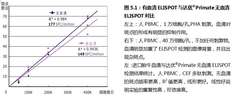 達(dá)科為公司做了一系列的有、無血清ELISPOT檢測對比試驗(yàn),并且在推廣ELISPOT技術(shù)的標(biāo)準(zhǔn)化以及建立ELISPOT檢測的質(zhì)控系統(tǒng)時(shí),都采用了無血清ELISPOT檢測技術(shù)。在所有的實(shí)驗(yàn)中達(dá)優(yōu)?都取得了優(yōu)于血清的結(jié)果??偨Y(jié)起來就是:背景更干凈,信噪比更高,頻率更穩(wěn)定,結(jié)果更真實(shí)。下圖5.1是一些實(shí)際案例。