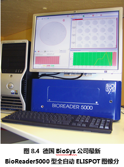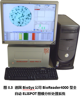 德國Bio-Sys公司從上世紀(jì)80年代開始就致力于生物圖像識別領(lǐng)域,在進(jìn)入ELISPOT圖像分析儀市場后一直以其先進(jìn)的ELISPOT斑點(diǎn)識別技術(shù)聞名。德國Bio-Sys公司首先解決了顯微攝像系統(tǒng)難以定位96孔板上的每一個孔的問題。其解決方法基于圖像識別技術(shù),利用板孔邊壁和真正的孔底的細(xì)微差別,在機(jī)械定位的基礎(chǔ)上,通過軟件識別來進(jìn)一步提高每孔的定位精度。是目前市場上所有ELISPOT圖像分析儀中唯一能夠完整識別整個孔底ELISPOT斑點(diǎn)圖像的設(shè)備。在對真假斑點(diǎn)的分辨中,德國Bio-Sys公司除了具備完善的物理學(xué)多參數(shù)識別技術(shù),還特別針對ELISPOT斑點(diǎn)形成的生物學(xué)過程,通過細(xì)胞因子顯色后的“光密度”峰值積分分析方法,精確分辨真假斑點(diǎn)、融合斑點(diǎn)等復(fù)雜情況。Bioreader系列ELISPOT圖像分析儀國外大多數(shù)較有經(jīng)驗(yàn)的ELISPOT實(shí)驗(yàn)室推崇的特點(diǎn)為:專業(yè)性和參數(shù)全開放性。因?yàn)镋LISPOT實(shí)驗(yàn)的復(fù)雜性,ELISPOT斑點(diǎn)形成在不同的實(shí)驗(yàn)條件下有非常大的差異。這就對ELISPOT圖像分析儀提出了較高的要求:既要能夠保證斑點(diǎn)計(jì)數(shù)的真實(shí)性和一致性,又要能夠根據(jù)不同情況,通過實(shí)驗(yàn)者的判斷來校正儀器對ELISPOT斑點(diǎn)識別的標(biāo)準(zhǔn)。要同時實(shí)現(xiàn)以上兩個要求,唯一的辦法是將儀器的所有判斷標(biāo)準(zhǔn)向ELISPOT實(shí)驗(yàn)者開放,實(shí)現(xiàn)實(shí)驗(yàn)者和儀器的互動。在這一方面,德國Bio-Sys公司始終走在ELISPOT斑點(diǎn)識別領(lǐng)域的前列,新的Bioreader-4000型(圖8.3)和Bioreader -5000(圖8.4) 型在專業(yè)性和適用性方面都領(lǐng)先于其他廠家的設(shè)備。