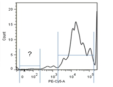 補償調(diào)節(jié)抗體的正確選擇對于熒光通道之間的補償調(diào)節(jié)是非常重要的。要求選擇的抗體所結(jié)合的抗原分子在樣本細胞中有明確表達,占樣品細胞的10%以上,50%以下。如果陽性細胞比例太低,在陽性細胞區(qū)域無法形成明顯的細胞團,無法判斷調(diào)節(jié)是否合適。如陽性細胞比例過高,則不表達該抗原的陰性細胞無法形成明顯的細胞團,如圖1-4直方圖所示。