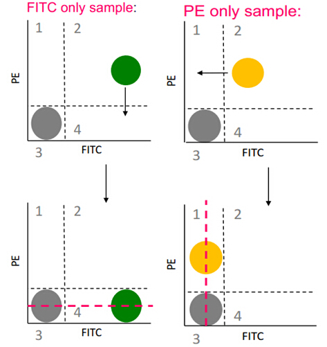 對于熒光補償?shù)拇_定,需運用以上補償?shù)幕驹聿⒔Y(jié)合特定的標本來實現(xiàn)。以FITC,PE雙色分析為例: