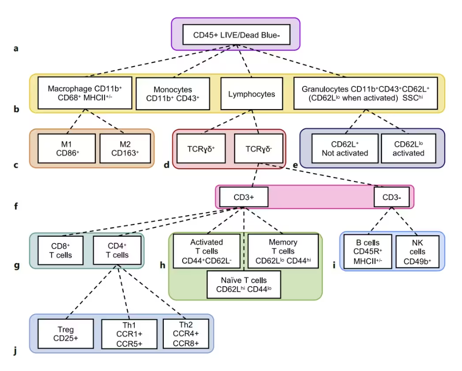 大鼠模型是生物醫(yī)學(xué)研究中重要的資源,因與人類免疫系統(tǒng)相似,而常被用于免疫相關(guān)的功能研究。然而目前小鼠模型在基礎(chǔ)和機制免疫學(xué)研究中占主導(dǎo)地位,相對缺乏對大鼠模型中免疫細胞的流式分析鑒定。本文將分享對大鼠常見免疫細胞的流式鑒定方案,鑒定分析不同組織中的粒細胞、巨噬細胞、T細胞、B細胞及NK細胞。
