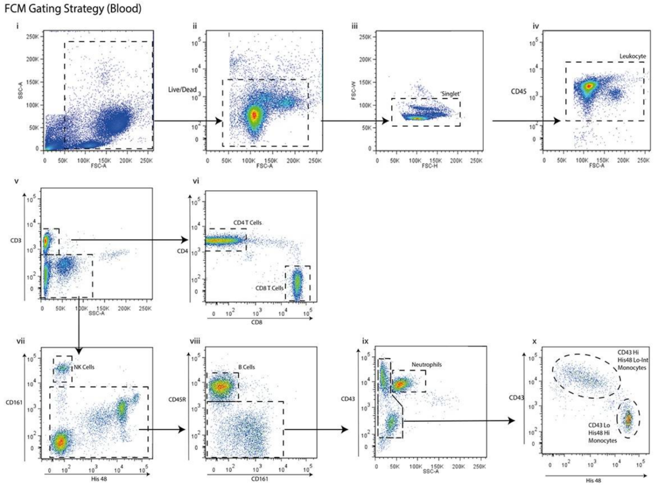 5. 中性粒細胞:從CD45+CD3-CD161-CD45R-的細胞中,圈出CD43+細胞(ix);