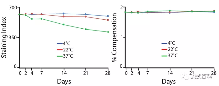 將PE/Fire? 700標記的抗體分裝后分別保存在4℃、22℃和37℃下。穩(wěn)定性可以根據(jù)抗體的染色指數(shù)(staining index)和熒光補償百分比來衡量,隨著保存時間的延長,3種溫度保存條件下光補償百分數(shù)并沒有發(fā)生改變,但是37℃的保存條件染色指數(shù)下降了約36%,22℃保存條件的染色指數(shù)下降了約12%,這主要是由于這兩種保存條件下抗體的非特異性染色背景升高引起的(檢測平臺為5激光Cytek? Aurora 光譜流式)。