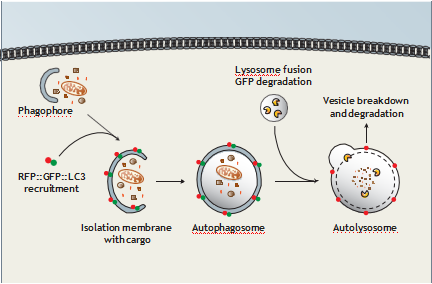 在自噬的早期,RFP和GFP信號均可被探知,當進入自噬體和溶酶體融合程序,GFP熒光信號消失,只留下可視的RFP熒光信號。GFP-LC3/RFP-LC3陽性細胞和RFP-LC3陽性細胞的比例可用來評估自噬潮的階段。
